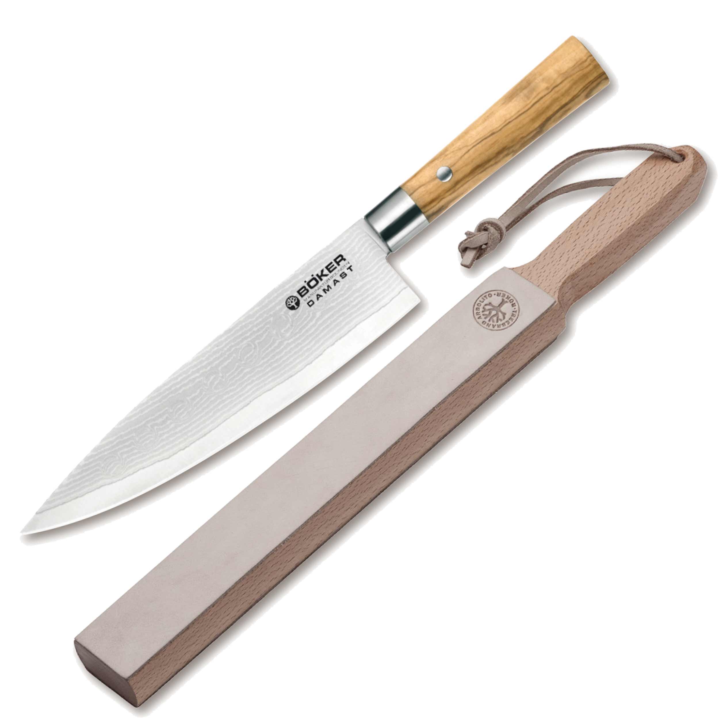 Produktinformationen "Böker Damast Olive Kochmesser mit Streichriemen"