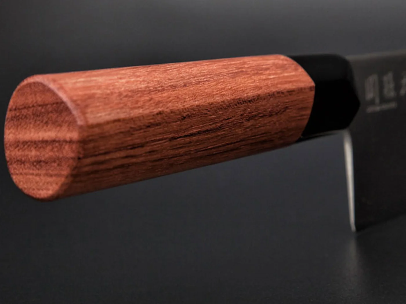 Der symmetrische Griff aus rotem Pakkaholz ist belastbar und feuchtigkeitsresistent; die traditionelle, zur Klinge hin schmal zulaufende Kastanienform liegt sicher in der Hand. Eine schwarzglänzende Polypropylen-Zwinge verbindet Griff und Klinge. Die Messerform Santoku eignet sich für wiegende und ziehende Schnitte. Das gestanzte Messer wiegt 130 g, hat eine Grifflänge von 13,5 cm und wird in Japan gefertigt.