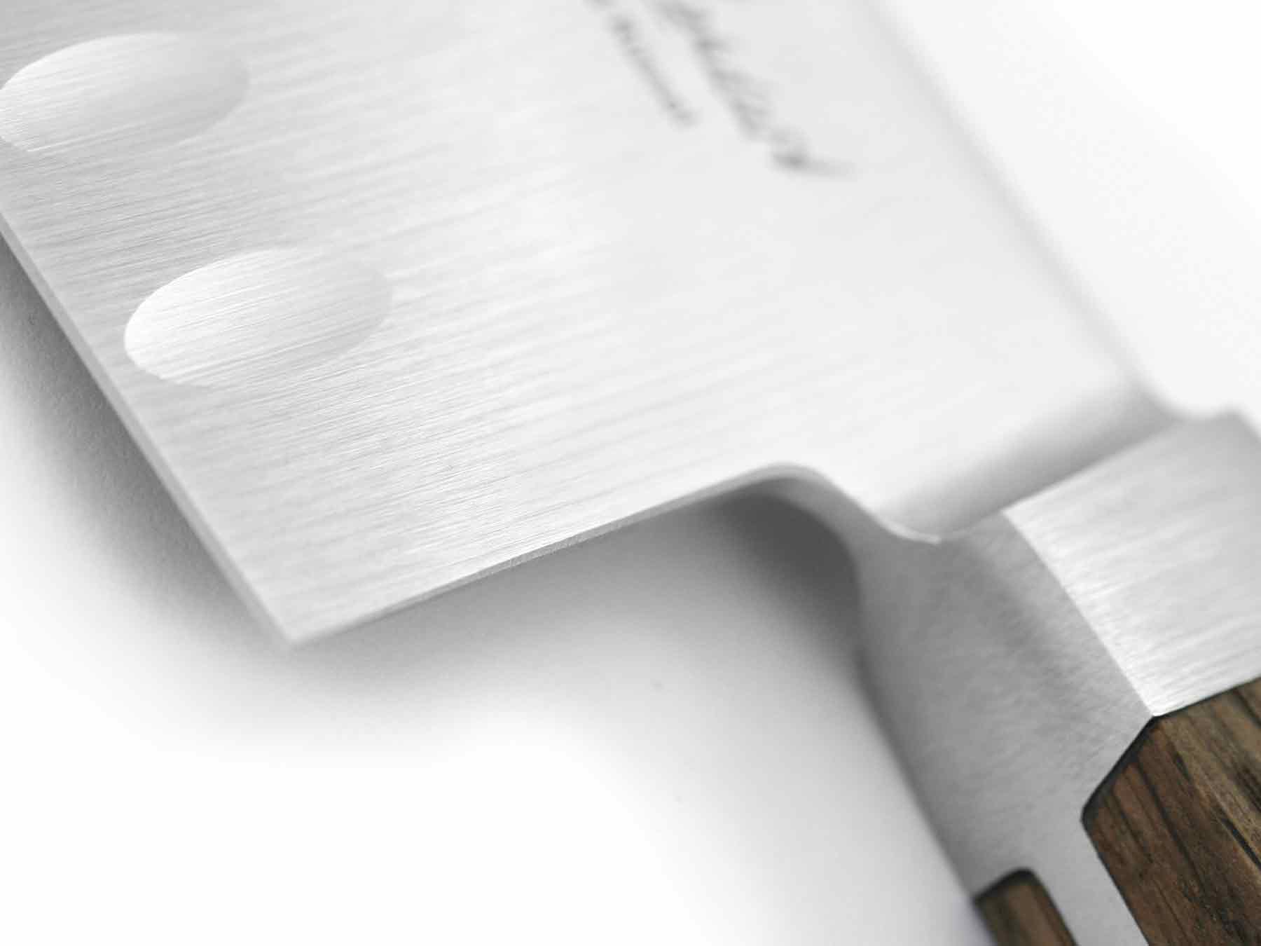 Güde Alpha Faßeiche Santoku mit Kullenschliff E546/18. Durch die Kullen entstehen beim Schneiden Luftpolster zwischen Klinge und Schnittgut. Dadurch werden Schneidreste, die an der Klinge kleben bleiben, auf ein Minimum reduziert. Santoku kommt aus dem japanischen und bedeutet drei (San) Tugenden (Toku). Santoku Messer sind demnach optimal zum Schneiden von Fleisch (1. Tugend), Fisch (2. Tugend) und Gemüse (3. Tugend) geeignet.