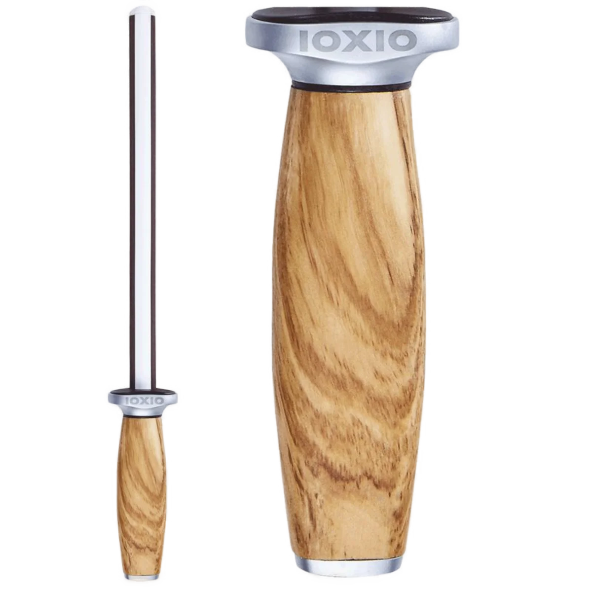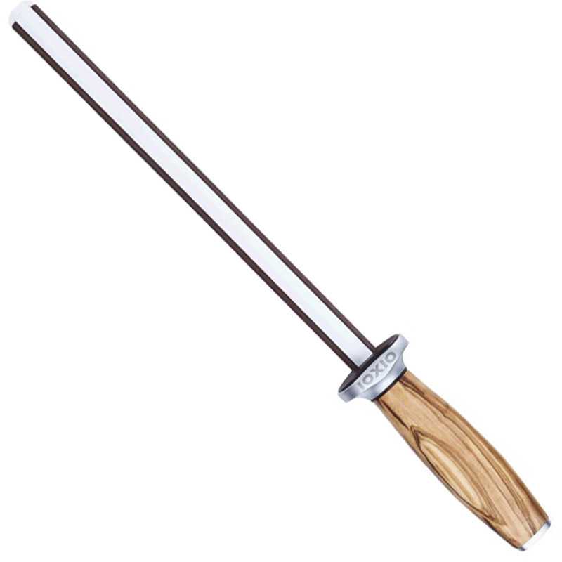 Der Ioxio Duo Keramik Wetzstab vereint zwei Schärfer in einem: 800er Körnung, blaue Keramik sowie 3000er Körnung, weiße Keramik. Das Highlight ist neben den hervorragenden Schäreigenschaften der wunderschöne Griff aus italienischem Olivenholz.
