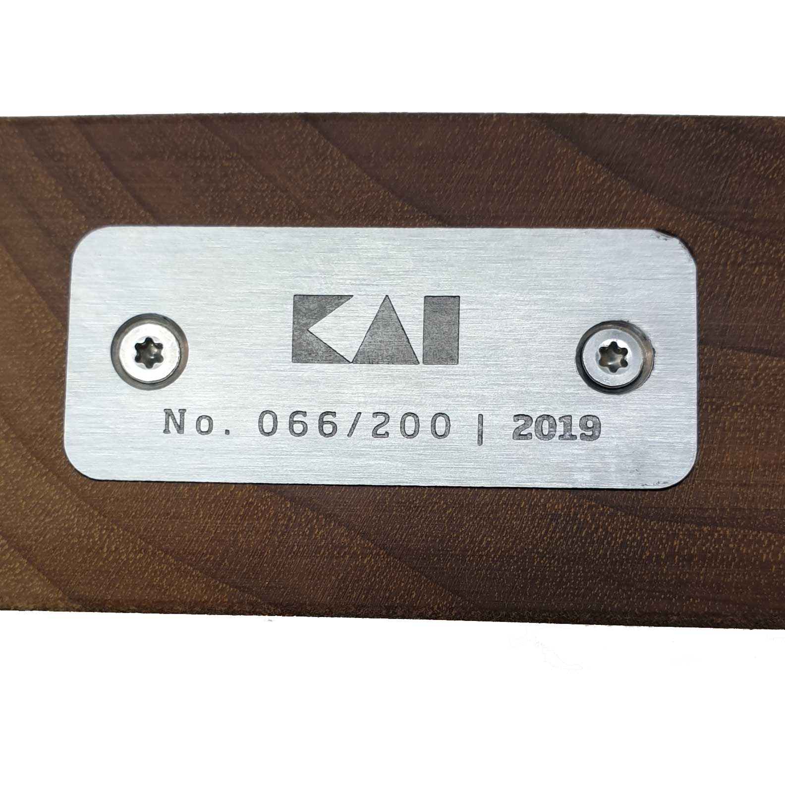 Die Manufactured Edition von KAI: Das DM-0809 Blockbrett aus Walnuss ist jedes Jahr auf 200 Stück limitiert, was es zu einem exklusiven Schneidbrett macht. Jedes Brett erhält eine indiviudelle Seriennummer und das Herstellungsjahr auf einer Metallplatine. Diese wird seitlich ins Holz eingearbeitet und fest verschraubt. Weil die Bretter aus einem einzigen Stück (Stamm) gefertigt werden, kann ihre Größe zwischen der Breite 35 bis 40 cm varrieren.