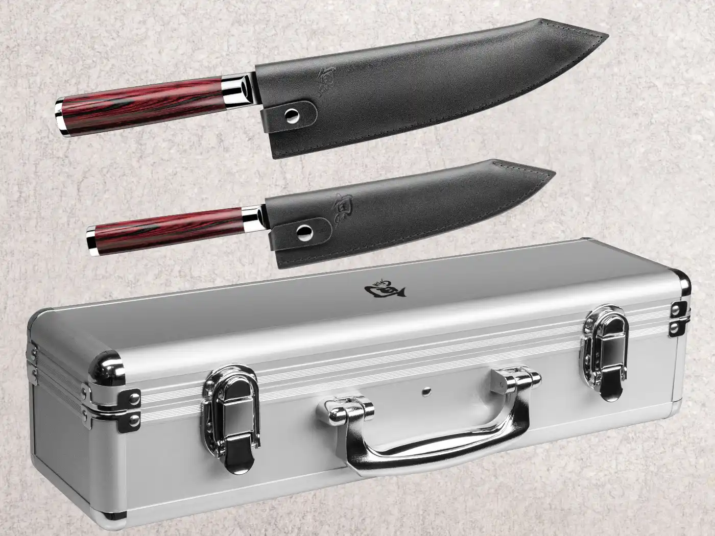 Anniversary Luxury Set mit Kochmesser, Klingenlänge 20 cm Allzweckmesser, Klingenlänge 15 cm Lederscheiden für beide Messer und hochwertigem Aluminium-Koffer