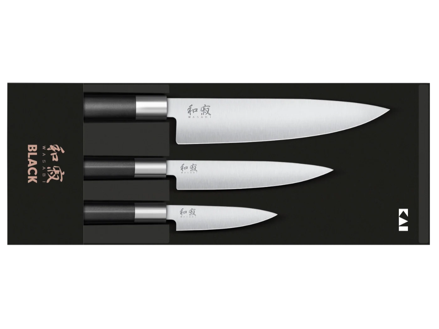 Das KAI Wasabi 67S-310 Set bietet eine solide Grundausstattung für vielseitige Schneidarbeiten in der Küche. Es umfasst ein Wasabi Black 6710P Allzweckmesser mit 10 cm Klingenlänge, ein 6715U Allzweckmesser mit 15 cm sowie ein 6716S Santoku mit 16,5 cm. Ob Obst, Gemüse, Fisch oder Fleisch – dank beidseitigem Schliff stehen präzise, kontrollierte Schnitte für unterschiedliche Anwendungen zuverlässig zur Verfügung.Die Klingen bestehen aus 1K6 Edelstahl mit einer Härte von 58 HRC und werden in gestanzter Herstellungsweise gefertigt. Griffe aus pflegeleichtem Polypropylen bieten Rechtshändern eine sichere Handhabung und liegen ausgewogen in der Hand. Die Messer der Serie KAI Wasabi Black werden in Japan hergestellt und eignen sich als robuste, unkomplizierte Alltagswerkzeuge für Vorbereitung, Zubereitung und feines Anrichten.