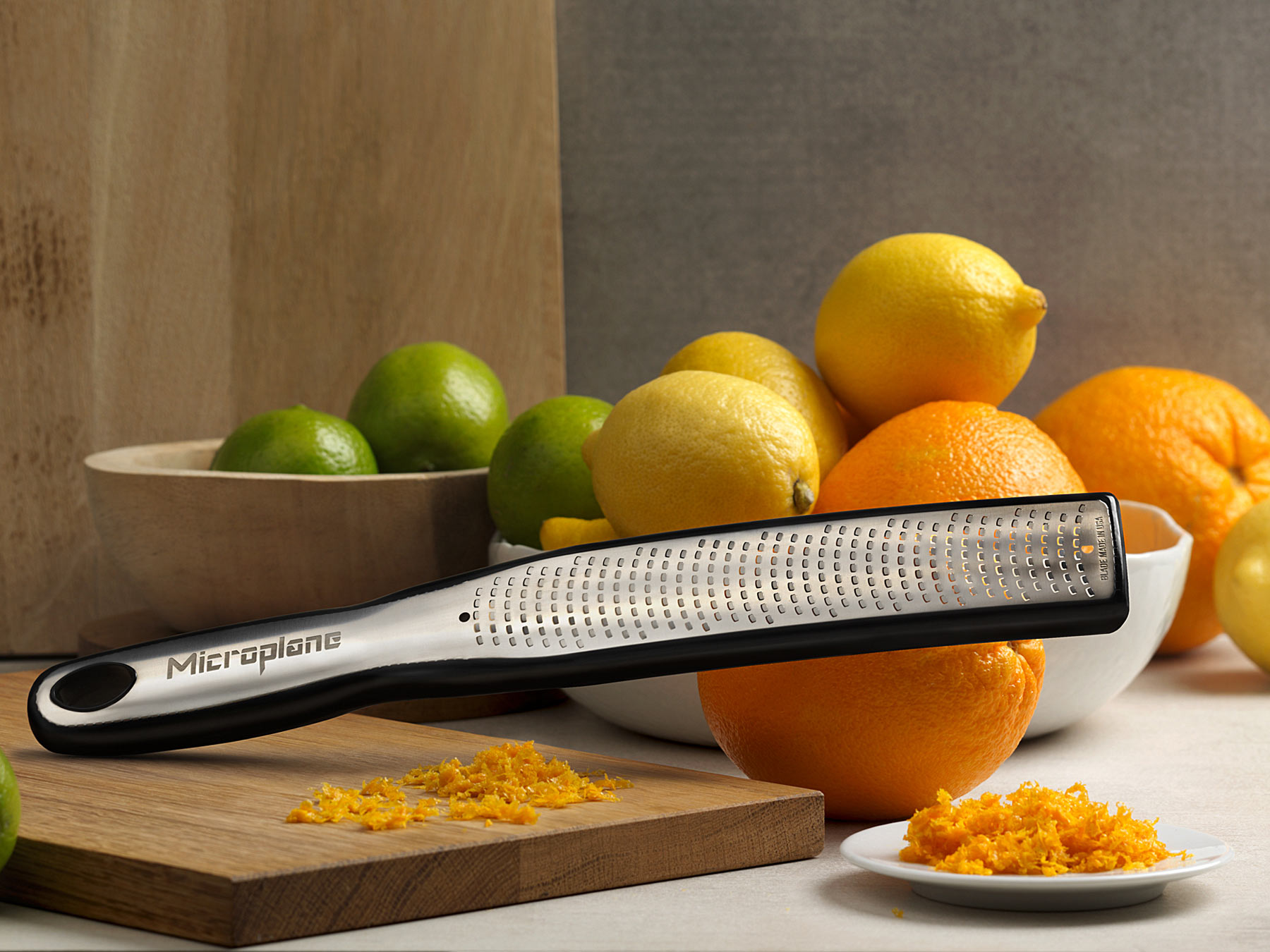 Die Reiben der Elite Serie von Microplane sind farbenfroh und in einem modernen Design gestaltet. Die Edelstahlreiben haben einen Rahmen aus Kunststoff, der in vier Farben erhältlich ist: Schwarz, Rot, Grün und Lila. Sie haben eine transparente Schutzhülle, die umgedreht gleichzeitig als Auffangbehälter und Messbecher (250 ml) verwendet werden kann. Sobald sich diese multifunktionale Hülle unter der Reibe befindet, bietet sie Hobby- und Profiköchen mehr Kontrolle und Sicherheit beim Reiben der Lebensmittel.