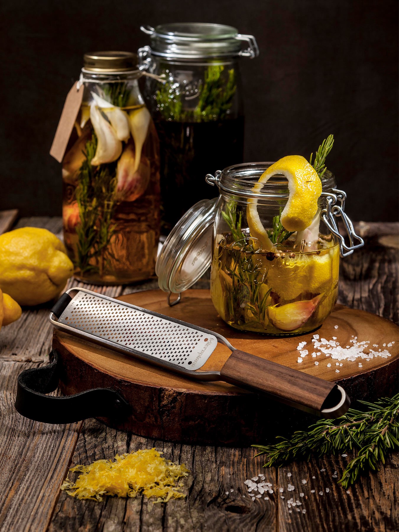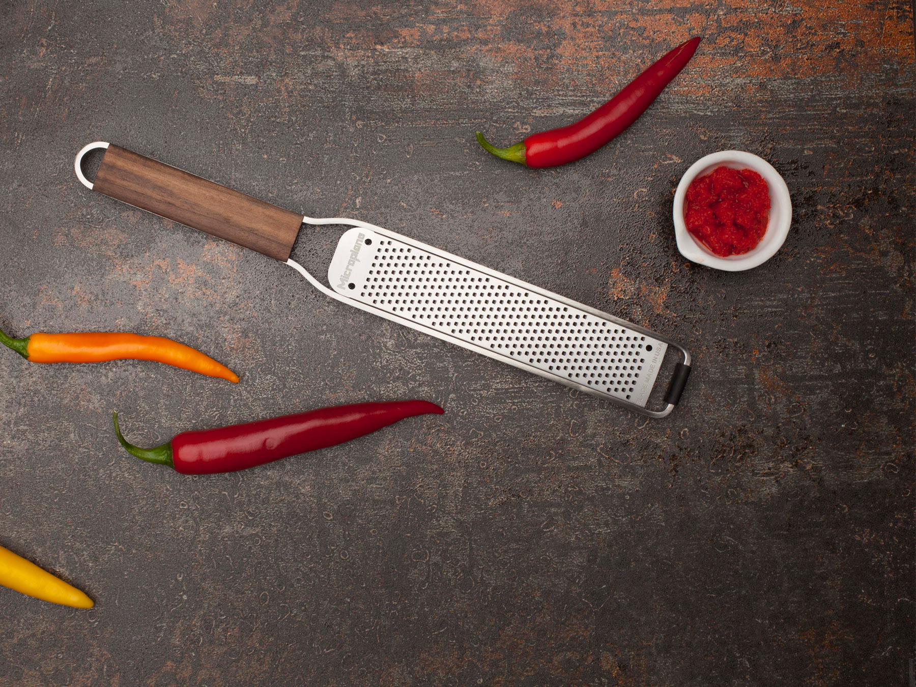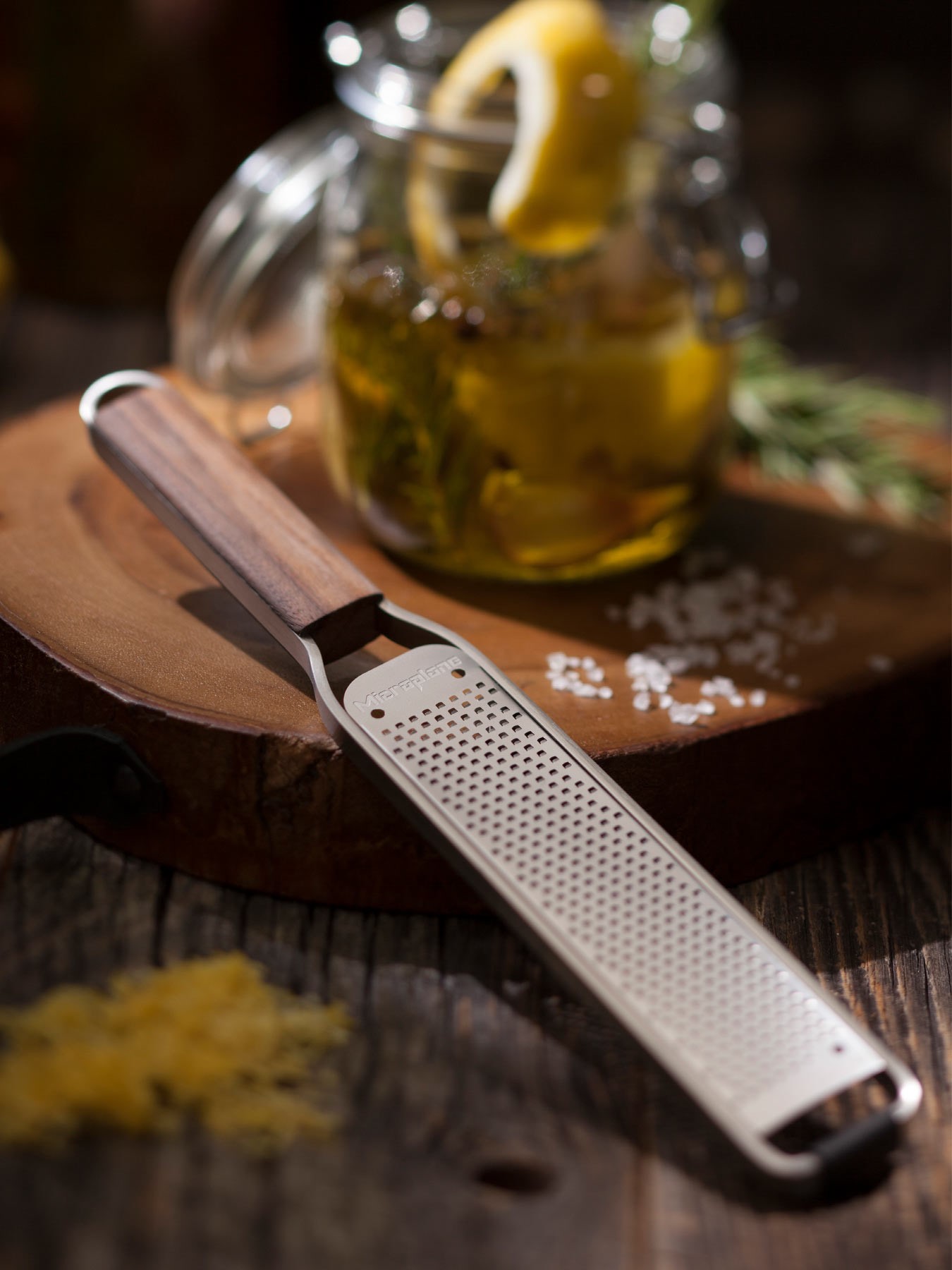 Die Reiben von Microplane Masterhaben einen eleganten Walnuss Holzgriff, einen robusten Edelstahlrahmen und photo-geäzte Klingen aus Edelstahl.