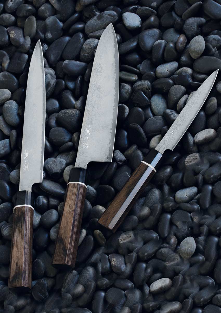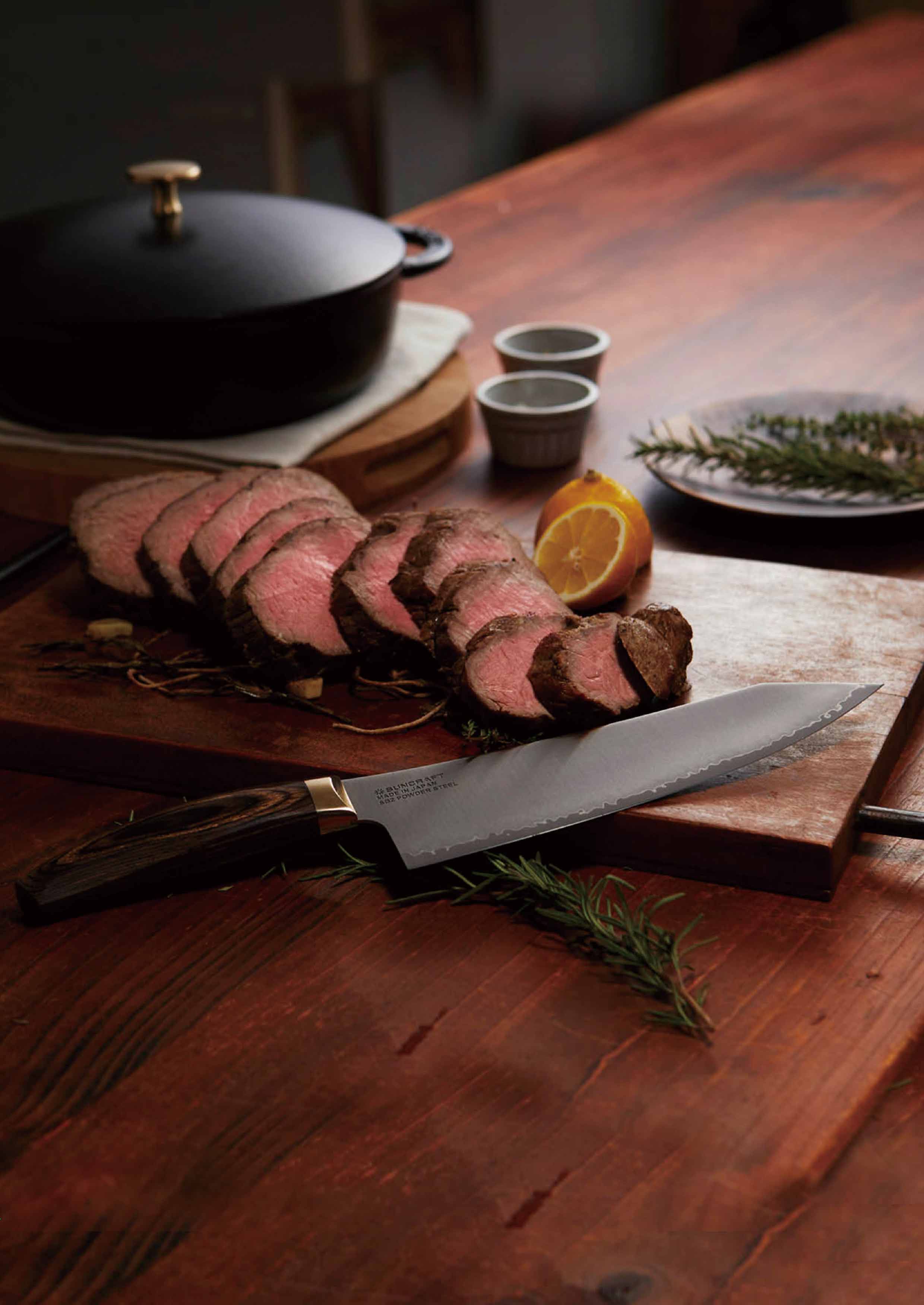 Die Serie Senzo Black kombiniert beeindruckende Schärfe mit dunkler Eleganz. Die Ästhetik der Messer wird durch ihr besonderes Klingenmuster hervorgehoben, dass durch sein Zusammenspiel aus hell und dunkel ein einzigartiges, dreidimensional anmutendes Bild ergibt. Der kubistische Octagon Griff der Messer besteht aus dunklem Pakkaholz, welches durch die Kombination aus unterschiedlich gefärbtem Birkenholz seine wunderschöne Optik erhält und durch seinen Harzanteil extrem langlebig und wasserbeständig ist. Bei dem Klingenstahl der Messer handelt es sich um VG-10 Damast mit einem Rockwellgrad von 62 HRC, der eine außerordentliche Härte und Schärfe garantiert. Mit sechs unterschiedlichen Messertypen und Klingenlängen wappnet die Serie für nahezu alle Kochherausforderungen ohne dabei an Eleganz einbüßen zu müssen.