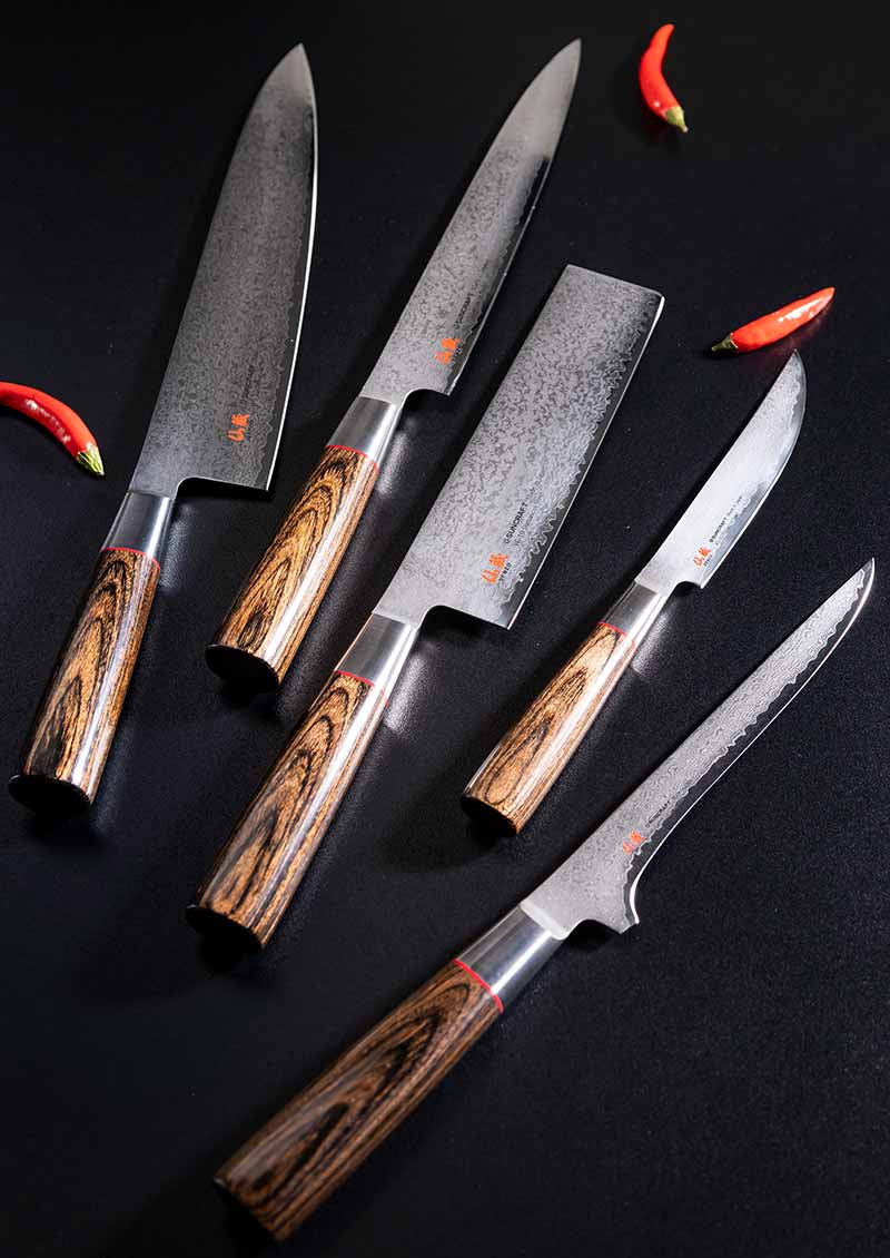 Die Suncraft Senzo Classic Serie bietet eine große Bandbreite an qualitativ hochwertigen Messern, mit der man für jede Herausforderung in der Küche gewappnet ist. Die sehr dünn ausgeschliffen Klingen der Serie bestehen aus dem von der japanischen Firma Takefu Special Steel Co. Ltd. produziertem hochwertigen VG-10 Damaststahl. Der Stahl wurde in jeweils 33 Lagen beidseitig um den Schneidkern der Rockwell Härte von 61 - 62 HRC geschmiedet. Der wallnussfarbige Griff aus Pakkaholz mit einem rotem Ring als Übergang zur Klinge sorgt für die passende, klassische Optik.
