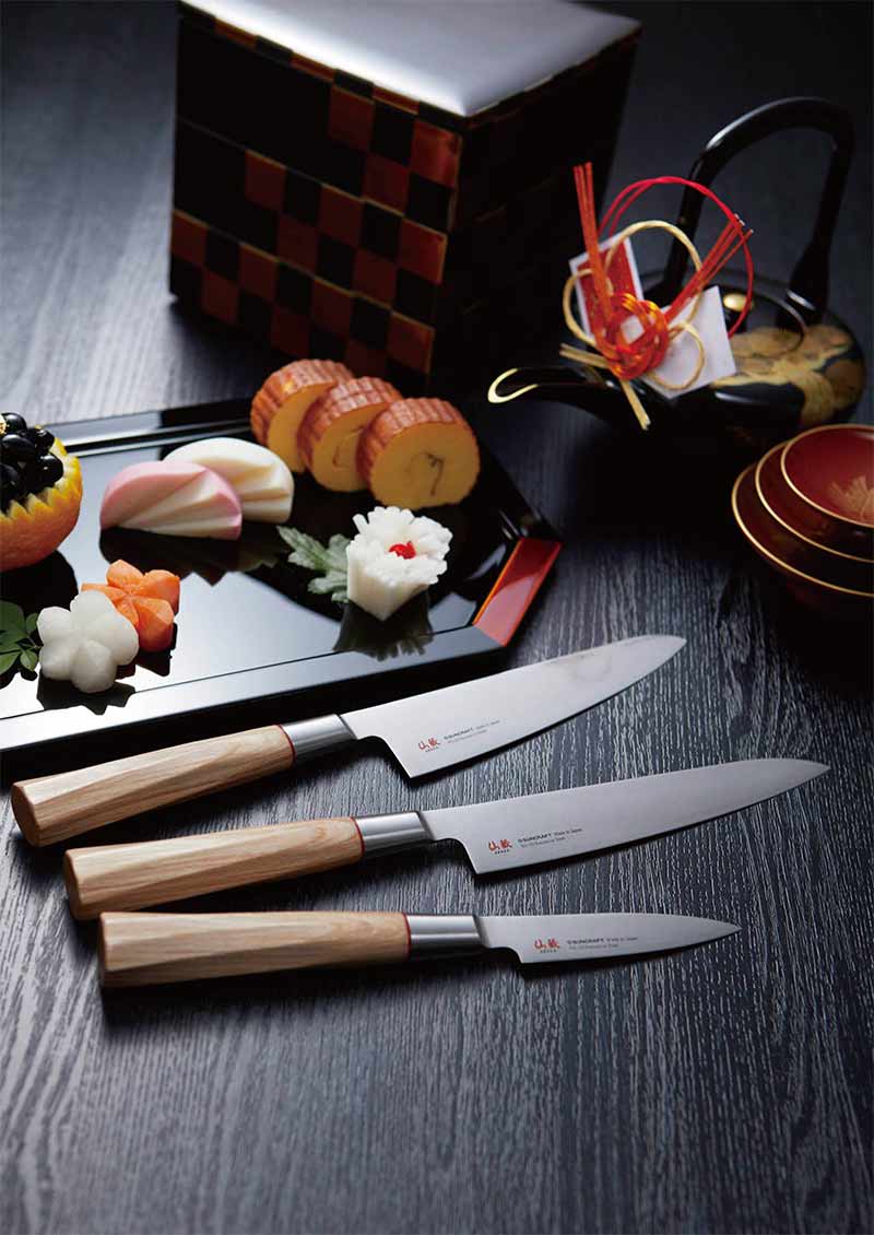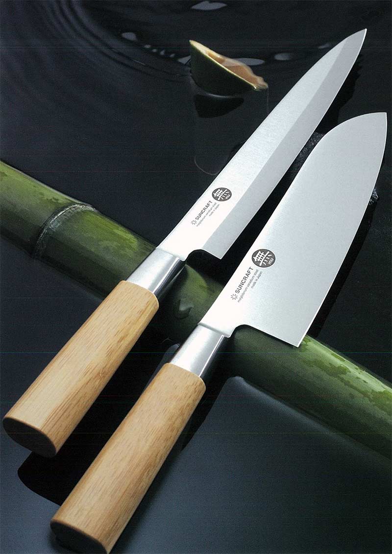 Suncraft MU - Japan meets Europe. Die Messer der MU Collection wurden vom italienischen Designer Carallo-Grandis und Pietro Leeman, dem Chef des Mailänder Sterne-Restaurants JOIA, entwickelt. Die Messer haben mit Ihrem hellen Griff aus Bambus Pakkaholz ein sehr puristisches und reduziertes Design. Die gesteckte rostfreie Klinge besteht aus japanischem Molybdän Vanadium Stahl (58+1 HRC). Durch das leichte Gewicht eignen sich die Messer auch für den intensiven und ermüdungsfreien Dauergebrauch. Die Serie beinhaltet die gängigen europäischen Klingenformen - vom Universalmesser bis zum Brotmesser. Aber auch Sushiliebhaber werden an dem typischen einseitig geschliffenen Yanagiba mit 27cm Ihre Freude haben.